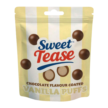 Crunch into pure indulgence with Sweet Tease Vanilla Puffs. Light, airy honeycomb puff candy coated in smooth chocolate delivers that irresistible melt-in-the-mouth moment with every bite. The delicate vanilla flavour shines through the satisfying crunch, making these 80g puffs the perfect treat for yourself or a gift. Bold, playful, and full of character